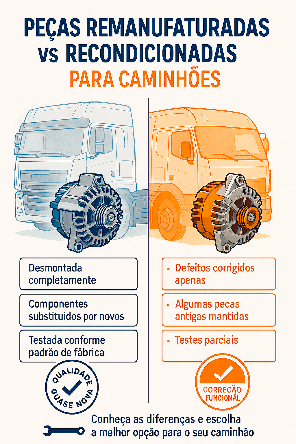 Na vida de quem vive da estrada, manter o caminhão em plena operação é fundamental. Quando surge a necessidade de substituir uma peça, é comum a dúvida: optar por uma peça nova, recondicionada ou remanufaturada?