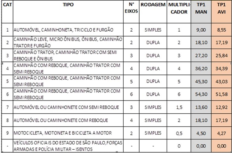 Confira, na tabela abaixo, as novas tarifas (válidas para veículos de passeio, motocicletas e, em caso de veículos comerciais, por eixo).